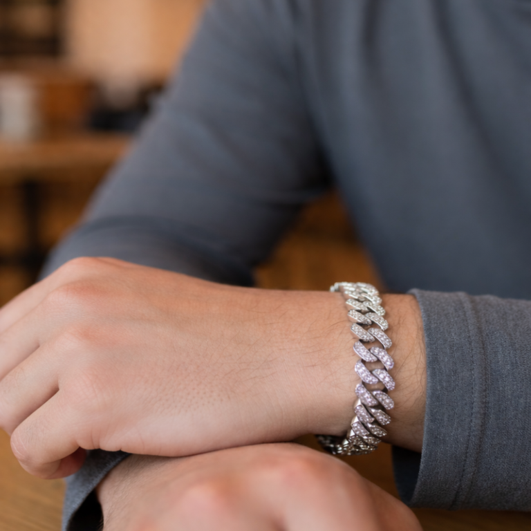 This bracelet features a bold and iconic Cuban link design, finished in a sleek silver…
